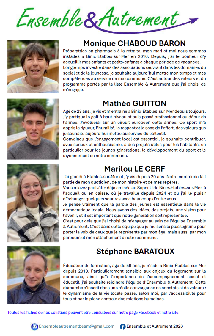 4 nouveaux membres de l'équipe Ensemble & Autrement se présentent aujourd'hui. Ils seront impliqués au sein de commissions et apporteront leurs compétences et leur motivation pour faire avancer des projets qui amélioreront le cadre et les conditions de vie des habitants de Binic-Etables-sur-Mer.