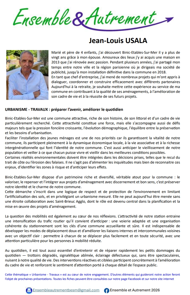 Jean-Louis USALA est passionné d'aménagement du territoire et d'architecture. Au service de la population, il aura le souci de conjuguer travaux et urbanisme avec une approche pragmatique et le souci du service aux habitants.